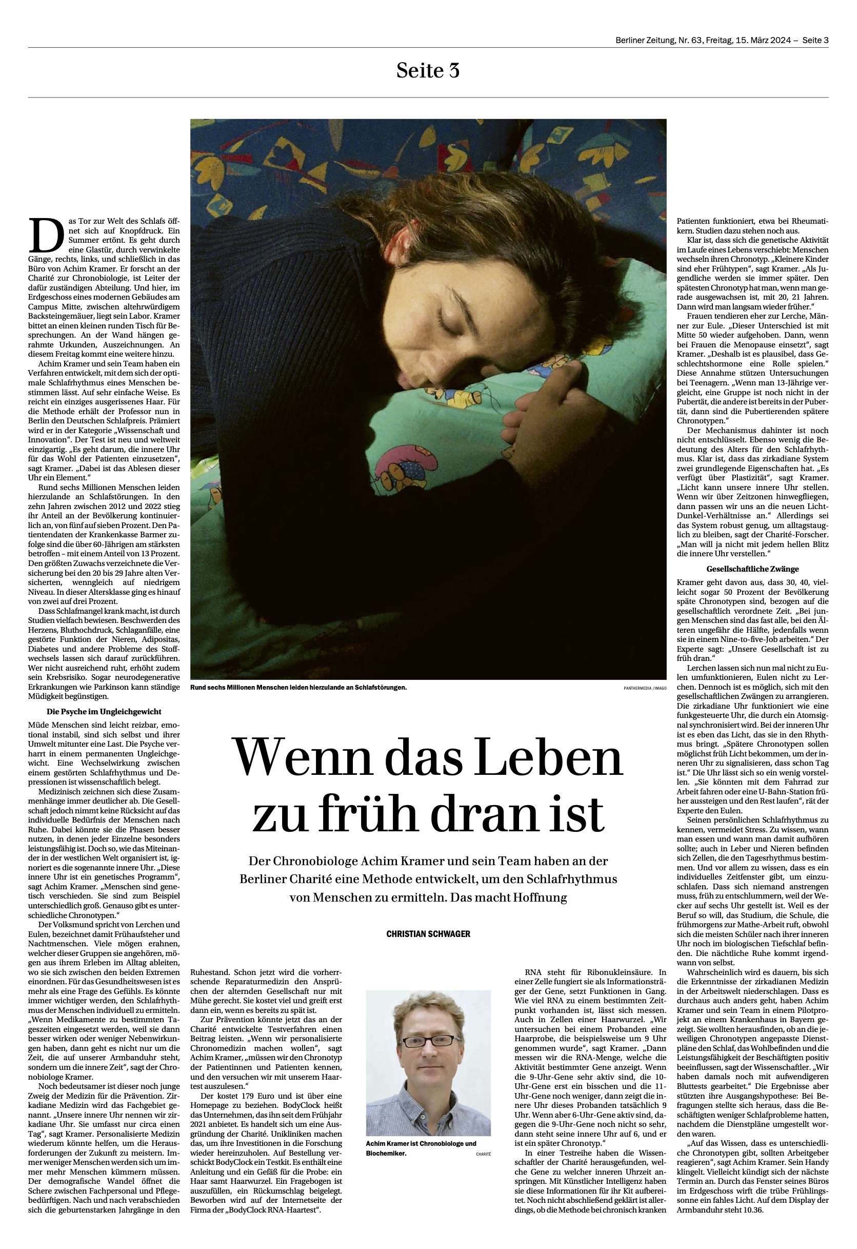 Hier das Interview mit dem Schlafpreisträger in der Kategorie „Wissenschaft und Innovation“ Prof. Achim Kramer, Chronobiologe an der Charité Berlin. Christian Schwager von der „Berliner Zeitung“ stellt die innovative Methode vor, mit der man heute per Haartest den individuellen Chronotyp bestimmen kann. Das ist nur ein Beispiel aus der langen Reihe von 62 Berichterstattungen über die Preisträger vom Deutschen Schlafpreis 2024.